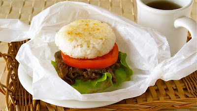 3、ごはん→サンチュ→マヨネーズ→焼肉→トマト→ごはんの順に重ねてできあがり。